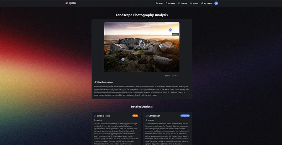 Upload your images and instantly, professional level, structured feedback so you can rapidly improve your landscape photography.