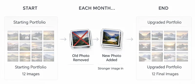 Each month you improve your portfolio with one clear goal: replace at least one image with something stronger (a new photo, or a reimagined older photo).
